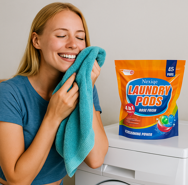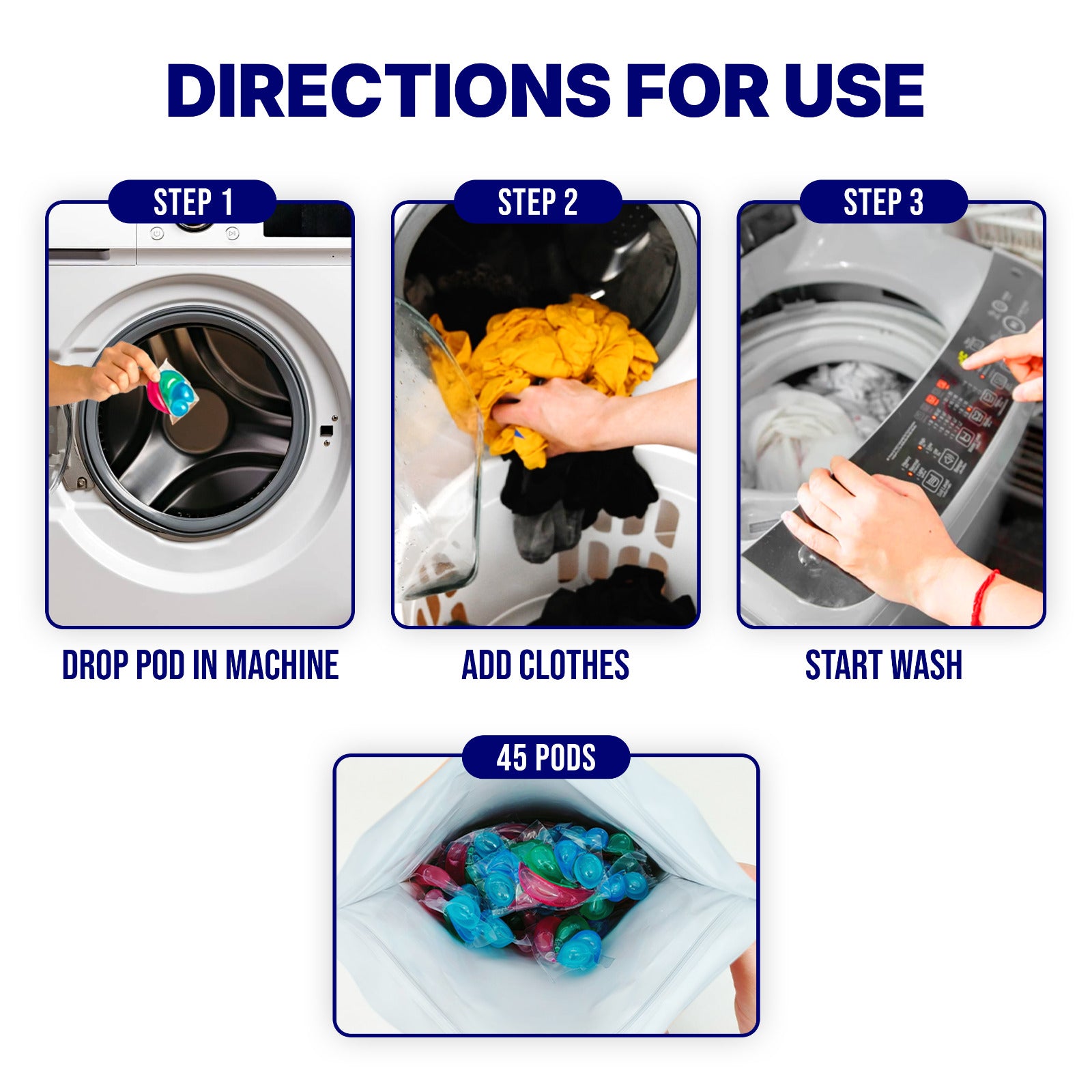 With dry hands , toss the pods in washing machine drum. Place clothes inside and start the laundry program.